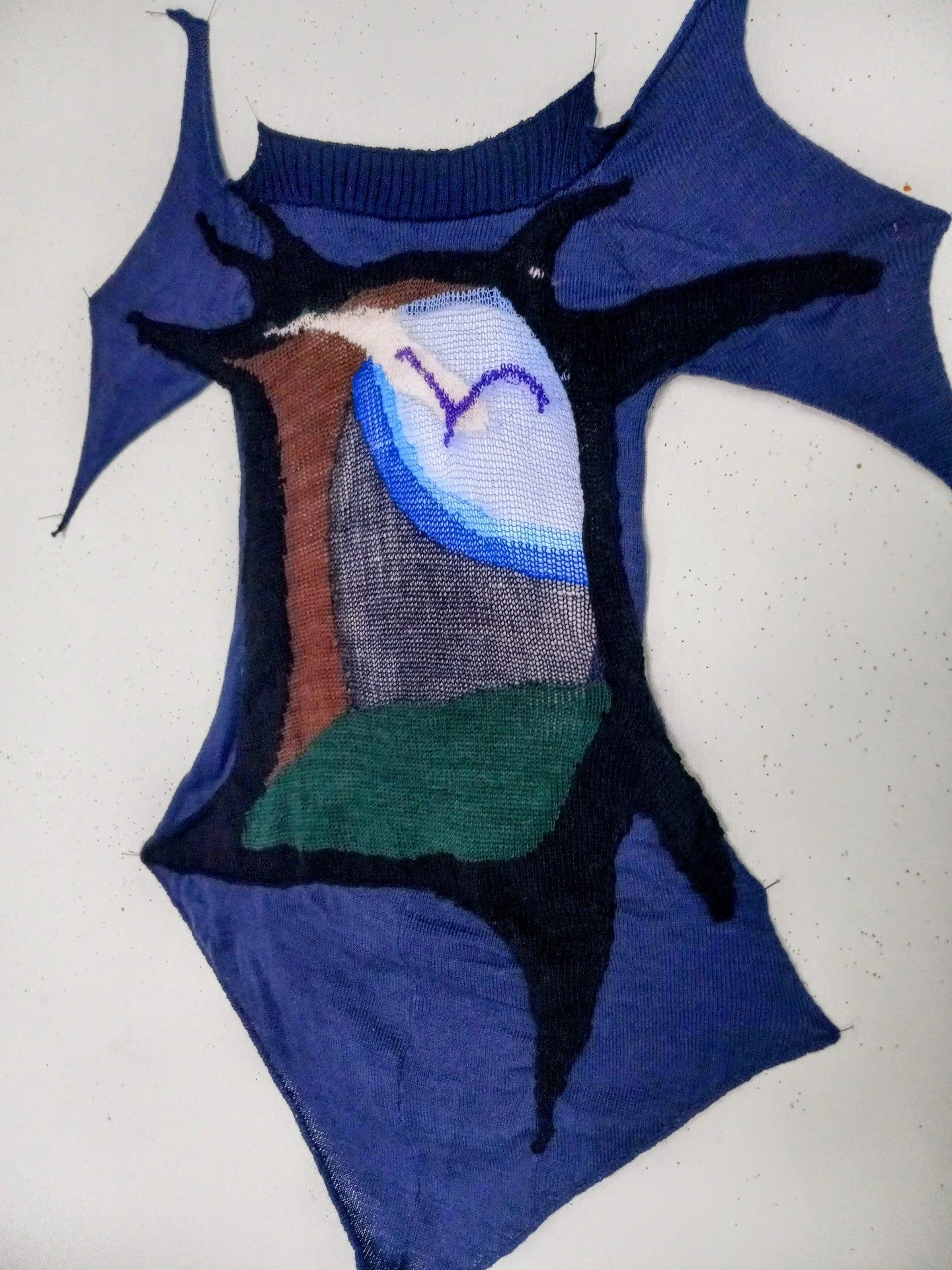 J’aime dire que je suis peintre en tricot. Je traduis la trace urgente des mains, par des techniques de construction rigoureuses et expérimentales. À travers un univers pictural forestier mystique, je tricote des pièces et des costumes uniques. Ma pratique s'inscrit dans un processus de transformation, puisant dans la poésie de l'innommable. Mes œuvres explorent les tensions d’un environnement sombre et nerveux, où la lumière surgit comme un spectre. On reconnaît mes surfaces verticales rugueuses, l’utilisation des cadres gothiques comme éléments de mise en scène théâtrale, et la dimension narrative de mes séries. C’est à travers des pièces d’expression profondément intimes que je m’ancre dans l’inconscient collectif, pour rejoindre l’universalité du monde symbolique.
